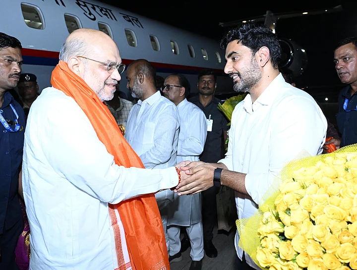 Chandrababu Naidu's son Nara Lokesh welcomes Union Home Minister Amit Shah as he arrives in Vijayawada for the swearing-in ceremony.
