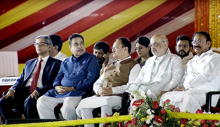 Former vice president Venkaiah Naidu and Union Ministers Amit Shah, JP Nadda, and Nitin Gadkari attend the swearing-in ceremony of Nara Chandrababu Naidu as the Chief Minister of Andhra Pradesh.
