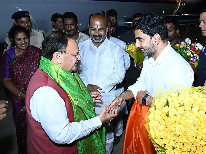 Chandrababu Naidu's son Nara Lokesh welcomes Union Health Minister JP Nadda as he arrives in Vijayawada for the swearing-in ceremony.