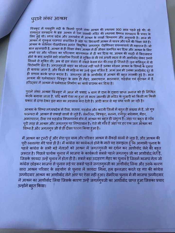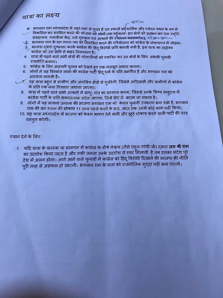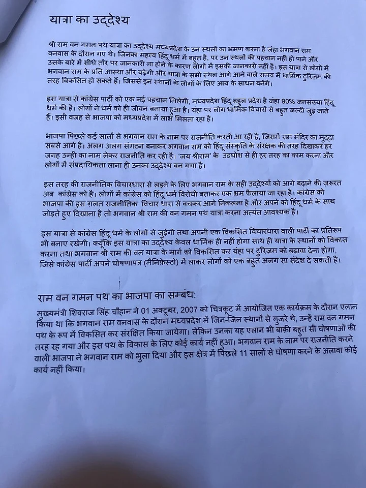 The Quint has accessed the original draft of the proposal authored by Shukla that explains exactly how the Congress should approach Hindutva in Madhya Pradesh. It begins with a statement of purpose which says “Is yatra se Congress party ko nayee pehchaan milegi” (the Congress will acquire a new identity because of this yatra).