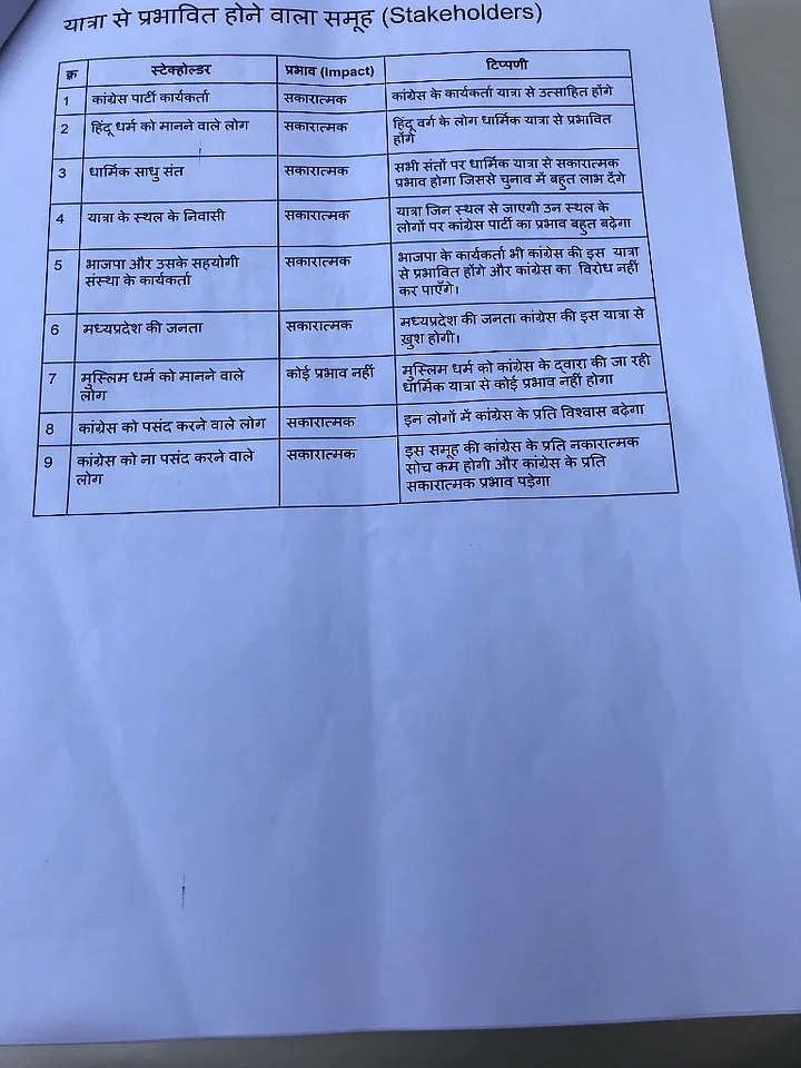 What’s also startling is that in his impact assessment of the yatra, Shukla presents a matrix of stakeholders who will be influenced by this experiment. These stakeholders include Congress party workers, believers of the Hindu faith, godmen, people living along the route of the yatra, the BJP and its affiliates, Muslims of Madhya Pradesh, traditional supporters of the party and those who dislike the Congress.