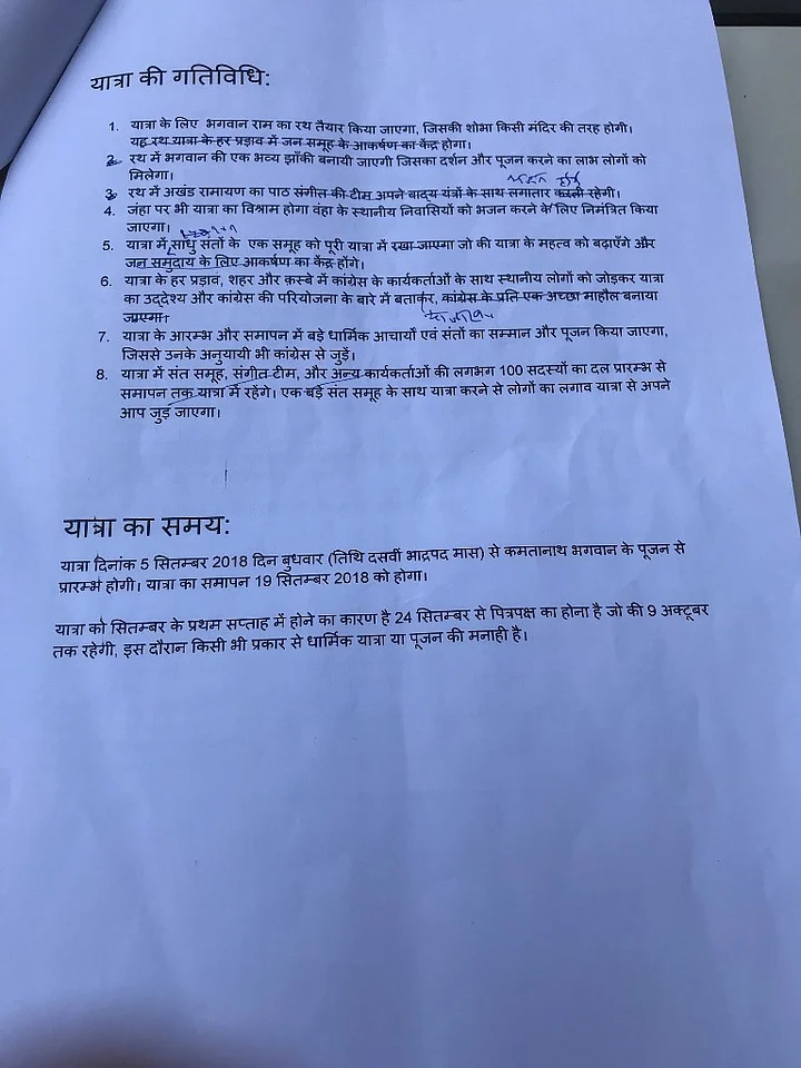 But perhaps for the first time a written document, that is, a 12-page proposal authored by the architect of the yatra, Congress Leader Harishankar Shukla, defines in detail the political design.