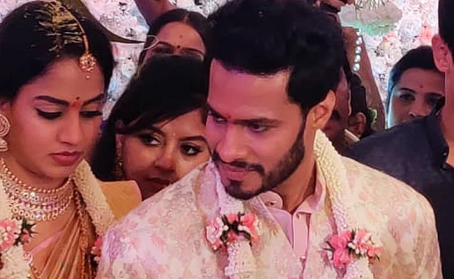 The couple wore matching clothes in gold and cream colours. Revathi wore a light peach and cream saree while Nikhil wore a sherwani.