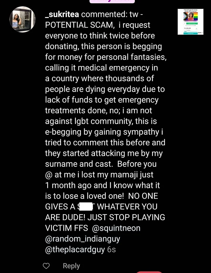 After being denied help from all corners, Raut finally turned to crowdfunding to meet the expenses incurred for gender affirmation care. Both Gope and Raut were inspired by crowdfunding campaigns run by other people to avail health and educational services. However, neither anticipated the degree of hate they would face for taking this decision.