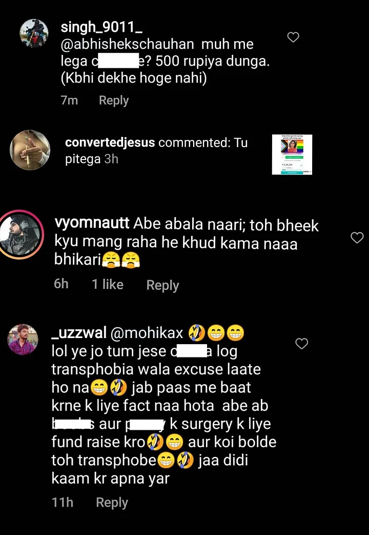 “There were comments like ‘apni girlfriend ko dhande pe bhej de, paisa aa jayega’, ‘chhakka’, ‘why begging, you’ve limbs, raise it yourself’. They have no idea about the difference between trans men and cis men.”Siddharth Gope