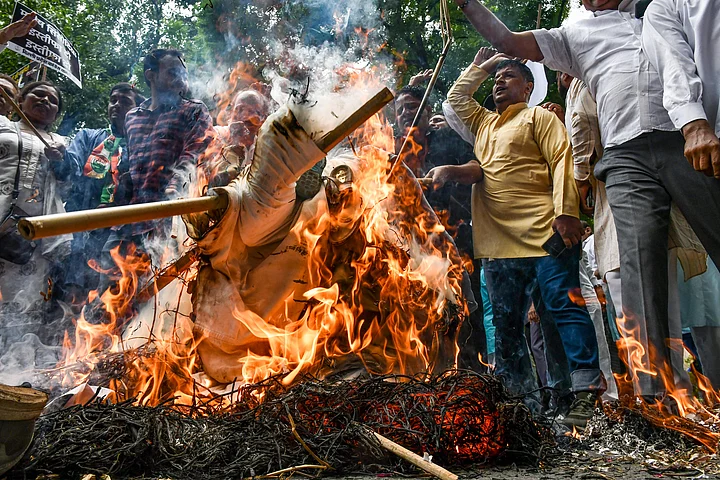 Congress workers burn an effigy during their protest demanding the resignation of Delhi Deputy Chief Minister Manish Sisodia, outside the DPCC office in New Delhi.