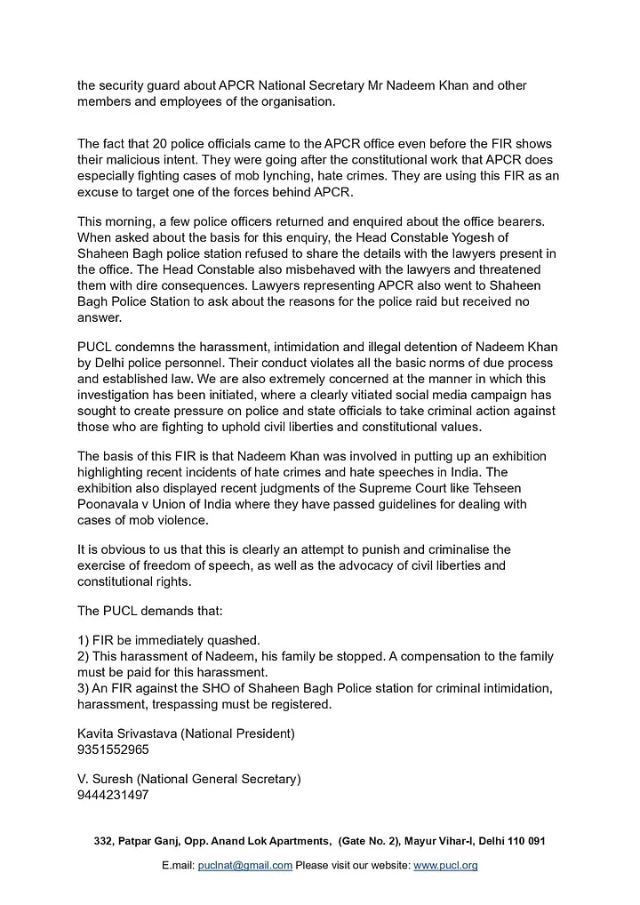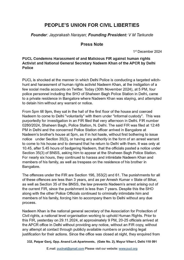 "It was only at 10:45, after 5:45 hours of badgering Nadeem, that the officials pasted a notice under Section 35 (3) of BNSS, asking him to appear at the Shaheen Bagh Police Station. For nearly six hours, they continued to harass and intimidate Nadeem Khan and members of his family, as well as trespass on the residence of his brother in Bangalore," alleged People's Union For Civil Liberties in a statement.
