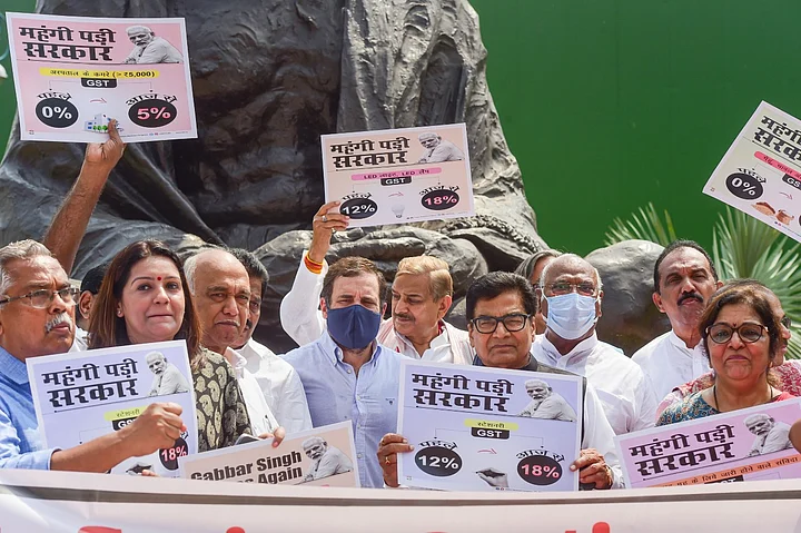 Congress MP Rahul Gandhi with other Opposition MPs took part in a protest against inflation and the Centre's decision to increase GST on food items, near the Gandhi statue at Parliament complex.