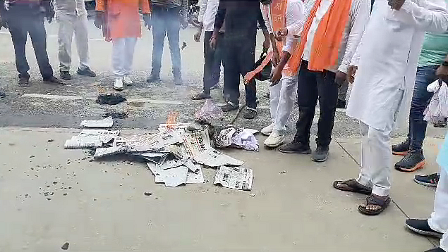 VHP and Bajrang Dal members raised slogans and burnt effigies at the District Magistrate's office in Azamgarh to demand action against the perpetrators of the Haryana violence.