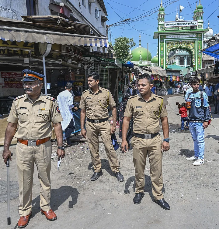Police personnel stand guard outside Mahim Dargah after Maharashtra Navnirman Sena called for agitation outside mosques, in Mumbai.
