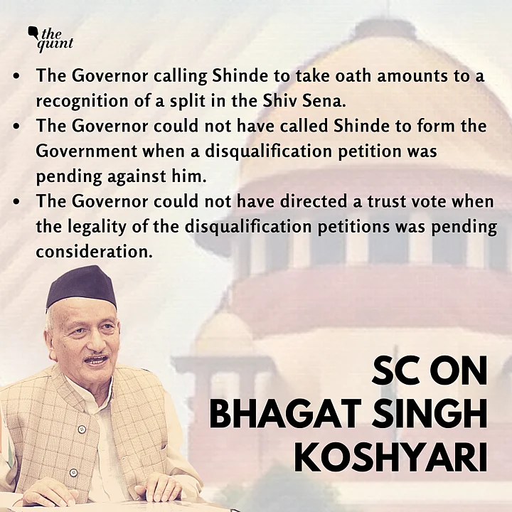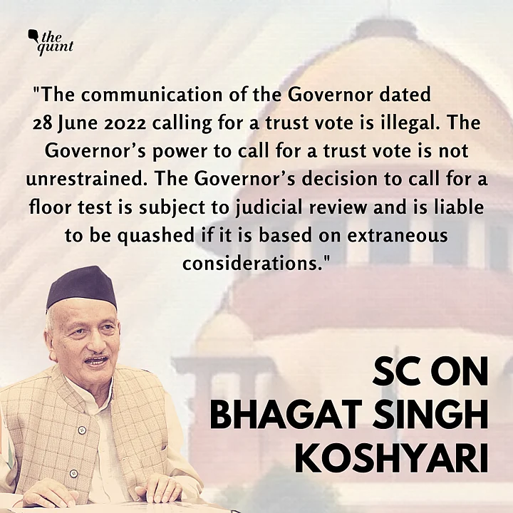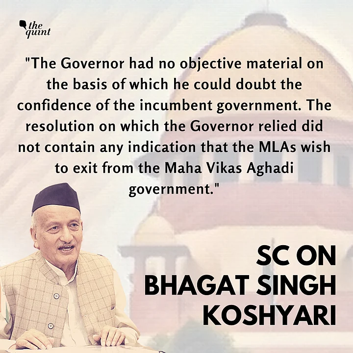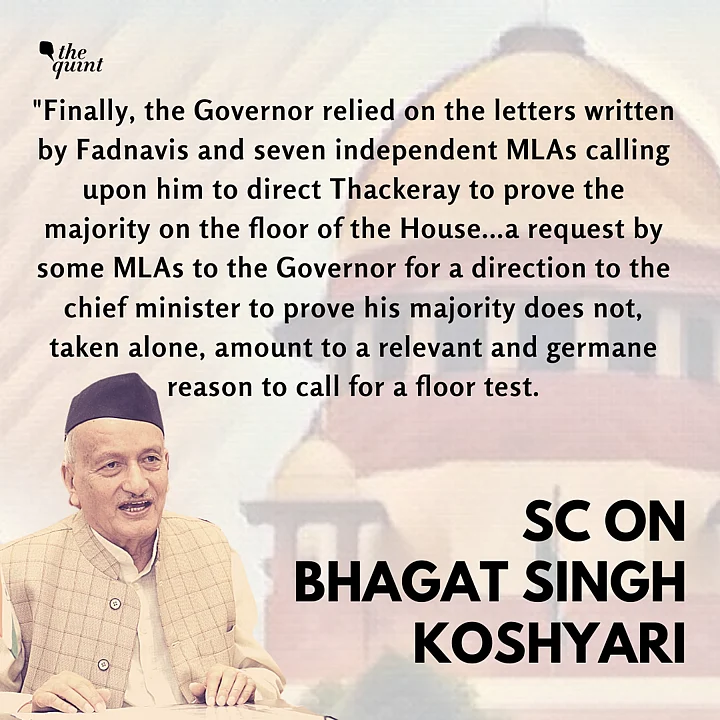 "The communication expressing discontent on the part of some MLAs is not sufficient for the Governor to call for a floor test. The Governor ought to apply his mind to the communication or any other material before him to assess whether the government seemed to have lost the confidence of the House," said the Supreme Court on Thursday, 11 May, while assessing the role of former Maharashtra Governor Bhagat Singh Koshyari amid the crisis that led to the fall of the Shiv Sena-led government last year.